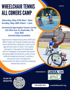 Sponsored in Nashville by the USTA and ABLE Youth, All-Comers Camps are day and a half tennis camps for youth up to age 18 who want to learn more about and grow in the sport of wheelchair tennis. Designed to provide instruction and play opportunities for youth of any skill and experience level, it will be a social and semi-competitive environment for kids to have fun playing wheelchair tennis. Email info@ableyouth.org to learn more. Register at https://playtennis.usta.com/ableyouth/Coaching/Course/0b82003a-f43f-4c33-a5a7-56cf5c322976