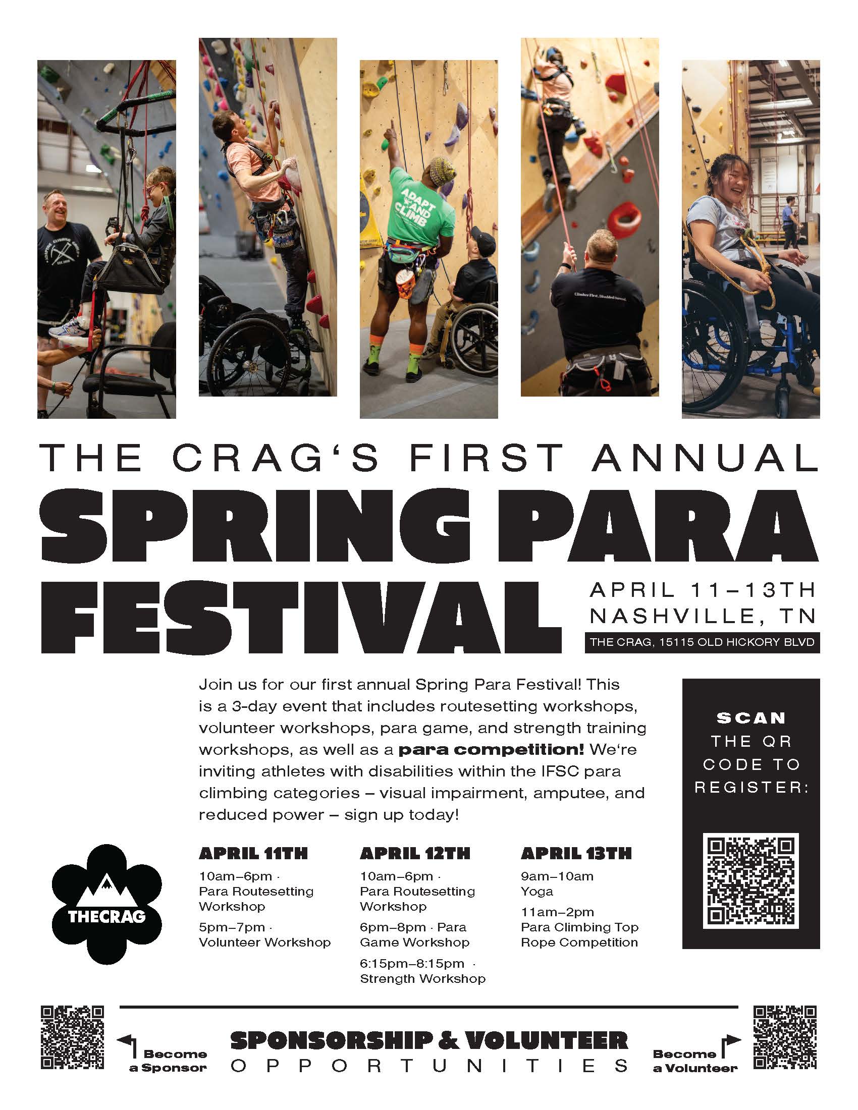 Check out The Crag’s very first Para Climbing Festival April 11th-13th! This is the biggest adaptive climbing event to ever happen in Middle Tennessee, and there is lots to do for all ages, both new and experienced climbers. Most events geared towards climbers are the 12th and 13th. Register HERE. Active ABLE Youth athletes can submit for a reimbursement at info@ableyouth.org.
