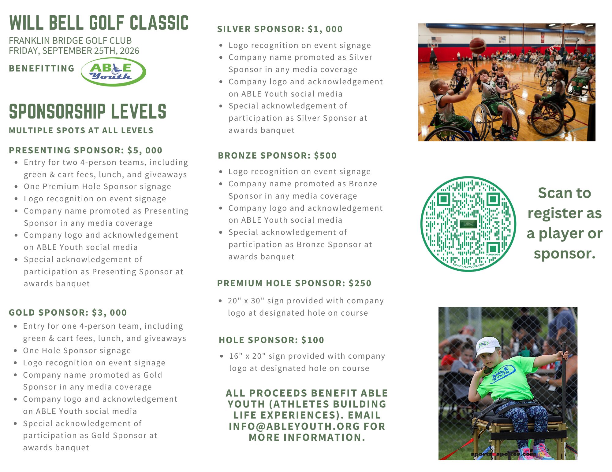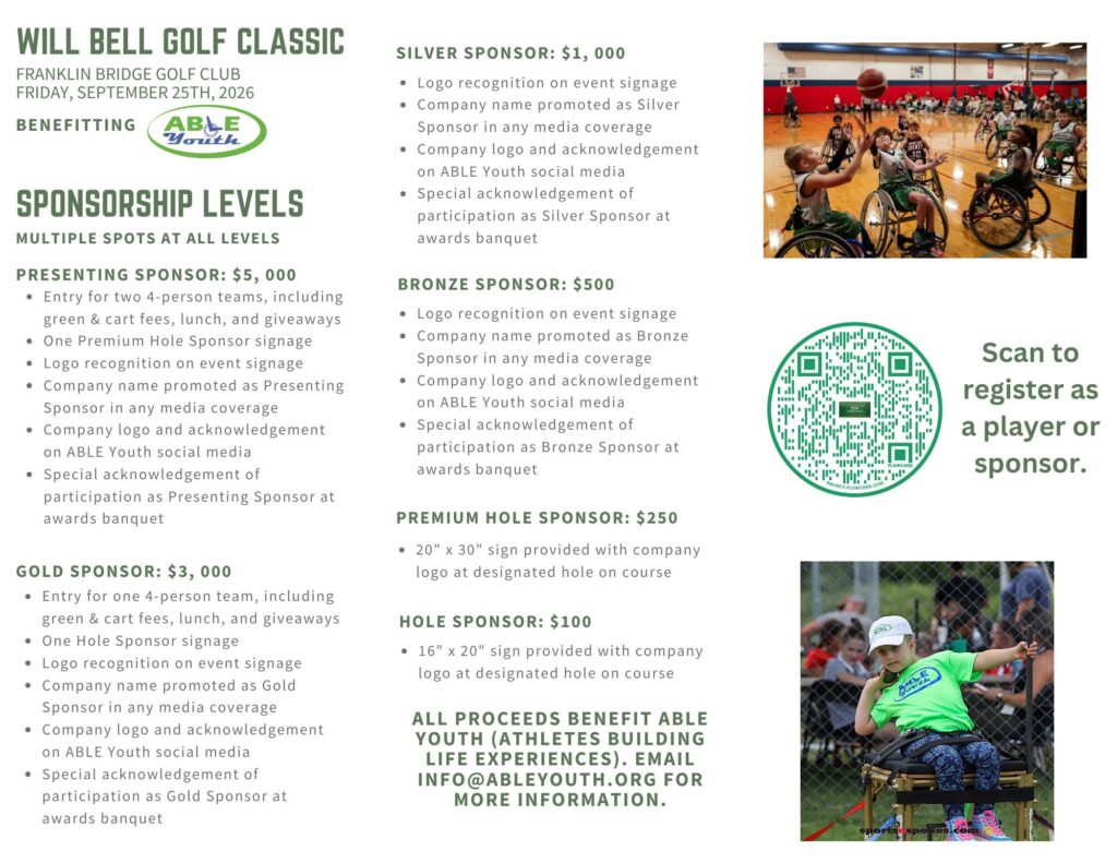 Join us Friday, September 25th for a wonderful day of golf benefiting the kids of ABLE Youth. Will Bell is a golf enthusiast and one of ABLE Youth’s success stories. He worked hard as a kid in ABLE Youth to learn how to be independent and loved adaptive sports, especially wheelchair basketball. He graduated and moved to Knoxville to attend UT and is now attending law school. He’s the epitome of what we want for all ABLE Youth kids…to work hard at independence, to enjoy life growing up, and to move on to college and the working world. Your participation in this year’s tournament makes that goal a reality for many more kids just like Will.